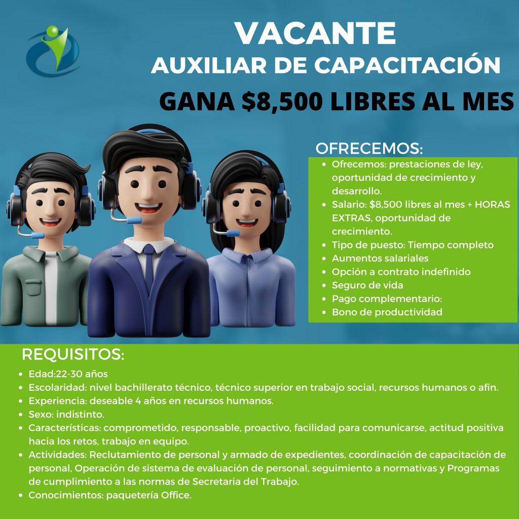- Escolaridad: nivel bachillerato técnico, técnico superior en trabajo social, recursos humanos o afín.